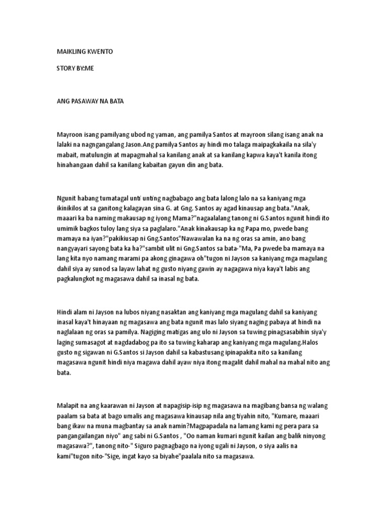 Habang papunta sa pamilhan nabangga siya ng isang nagmamadaling batang lalaki. 2020-11-04 Maikling kwento tungkol sa batang pasaway. Mayroon isang pamilyang ubod ng yaman ang pamilya Santos at mayroon silang isang anak na lalaki na nagngangalang JasonAng pamilya Santos ay hindi mo talaga maipagkakaila na silay mabait matulungin at mapagmahal sa kanilang anak at sa kanilang kapwa kayat kanila itong hinahangaan dahil sa kanilang kabaitan gayun din ang bata.