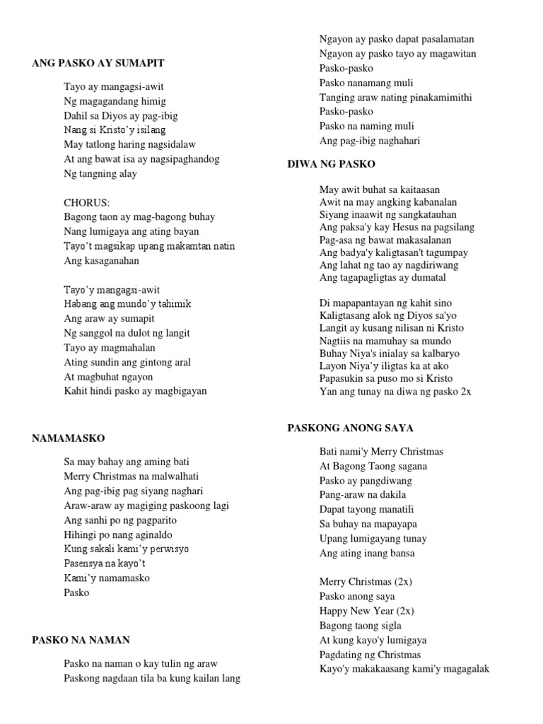 Ang Pasko ay sumapit Tayo ay mangagsi-awit Ng magagandang himig Dahil sa ang Diyos ay pag-ibig Nang si Kristo ay isilang May tatlong haring nagsidalaw At ang bawat isa Ay nagsipaghandog ng. Tuwing Pasko aking naririnig brMga awit na kay saya brMga tao ay masisigla brLahat silay pawang masasaya brSana ay laging ganito brKahit na di araw ng Pasko brMasayang lagi ang mundo brHabang nabubuhay tayo brCHORUS brSanay laging ganito brMasayang lagi ang mundo brOh. About Press Copyright Contact us Creators Advertise Developers Terms Privacy Policy.