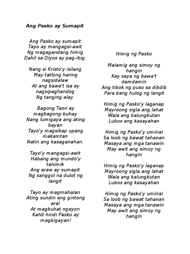Ang Pasko ay sumapit Tayo ay mangagsi-awit Ng magagandang himig Dahil sa ang Diyos ay pag-ibig. Bawat Paskoy may dalang himala Malakas man ulan itoy titila. Ang Pasko ay sumapit Tayo ay mangagsi-awit Ng magagandang himig Dahil sa ang Diyos ay pag-ibig Nang si Kristo ay isilang May tatlong haring nagsidalaw At ang bawat isa Ay nagsipaghandog ng tanging alay Bagong taon ay magbagong-buhay Nang lumigaya ang ating bayan Tayoy magsikap.