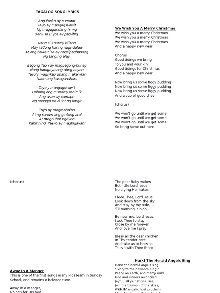 Awit ng pasko lyrics. Dec 19 2020 Lyrics by Robert Labayen Music by Jumbo Bojam De Belen. Dec 25 2020 TAGALOG LYRICS ENGLISH TRANSLATION. Bawat Paskoy may dalang himala Malakas man ulan itoy titila Bubuhos ang pagpapala may kapiling ang nangungulila.