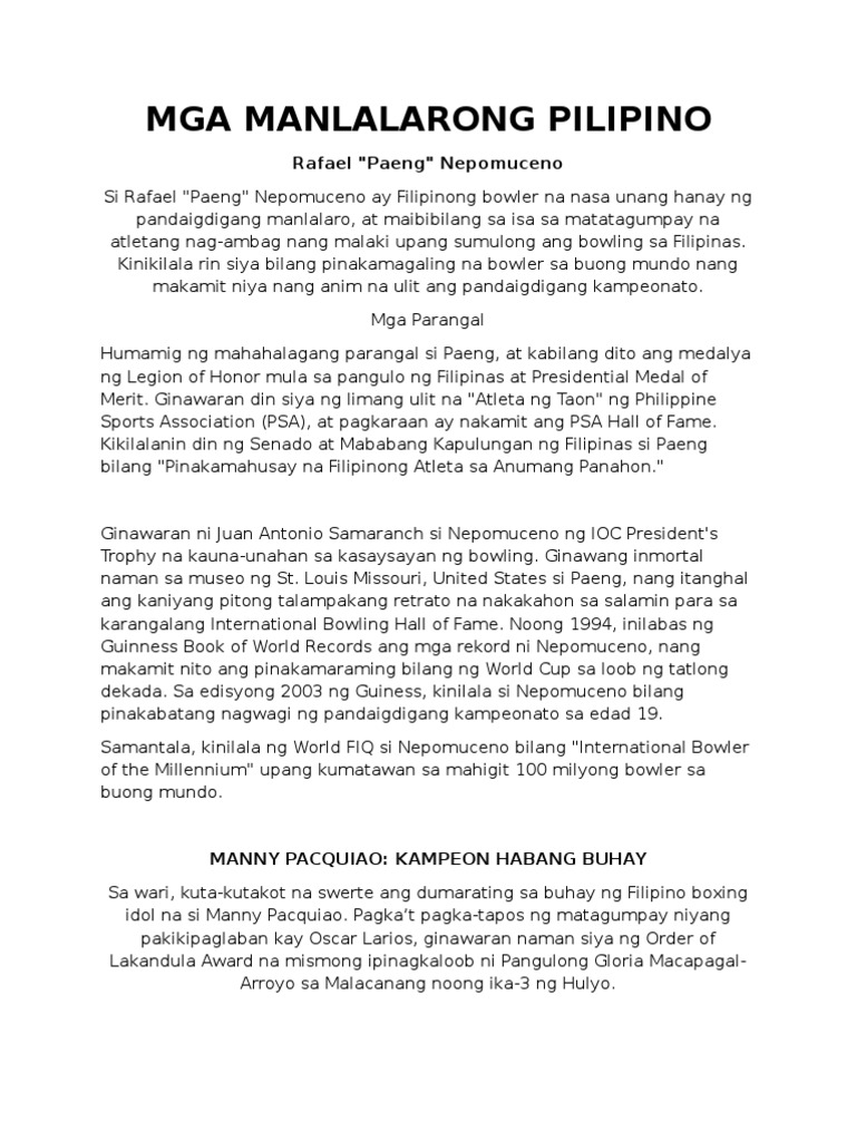 Magsaliksik Ng Mga Kilalang Pilipino Sa Larangan Ng Sports Gumawa Ng Sanaysay Rito