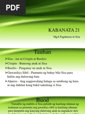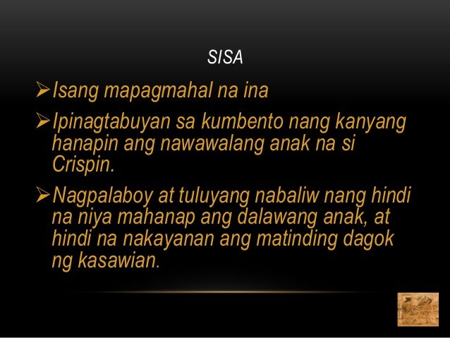 2021-04-11 Sino ang panganay na anak ni sisa. Nakatatandang anak ni Sisa na isang sakristan at tagatugtog ng kampana sa kumbento. Ang panganay na sampung-taong gulang ay si Basilio at ang pitong taong gulang bunso naman ay si Crispin.