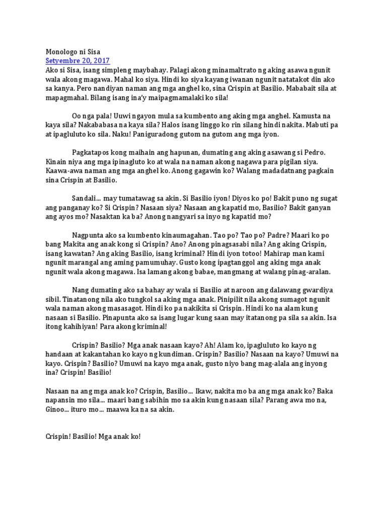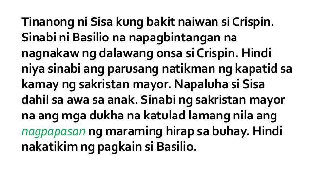 Panoorin ang FIRST AT SECOND VIDEOS sa link na itohttpsyoutubeD-ZPmuNX4HkhttpsyoutubeCx9BjWpT6PUNanay inireklamo ang anak na panganay na. Tagpuan Simbahan dito napadaan ang Pilosopo na. CRISPIN- bunsong anak ni Sisa.