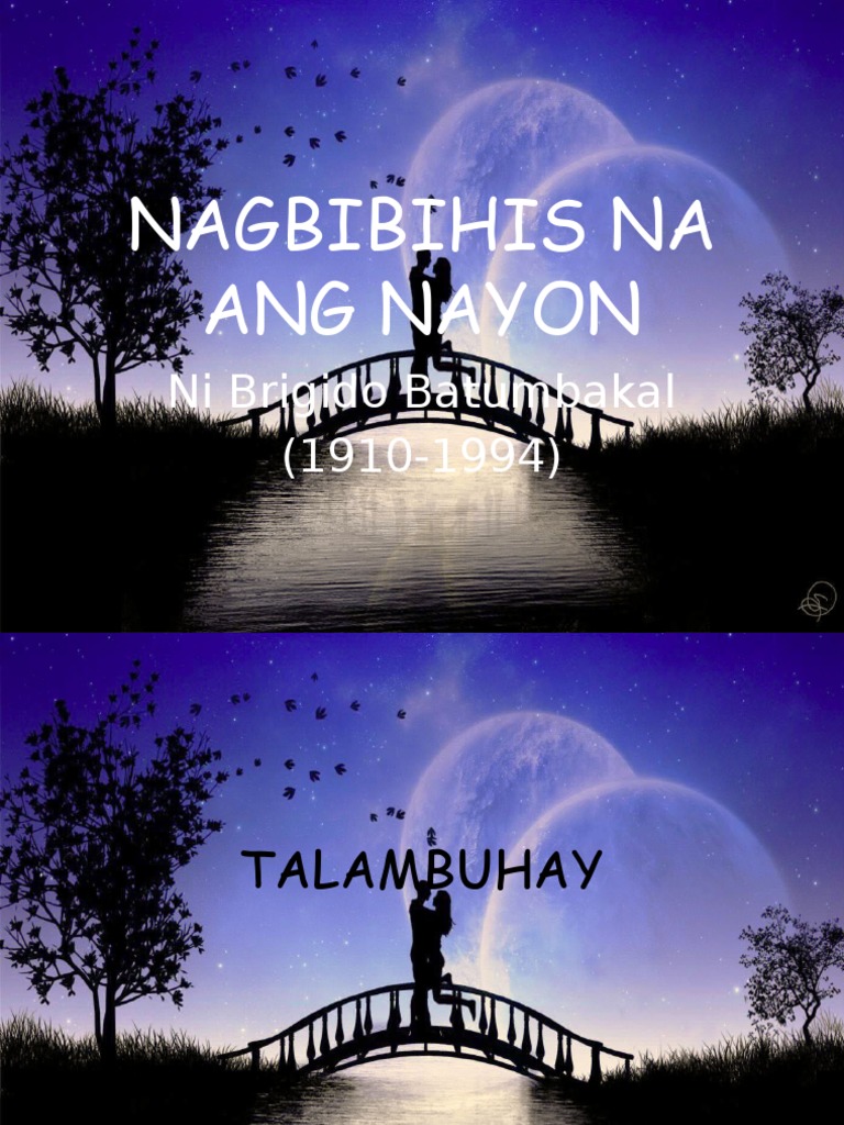 ANG NAYON Ni Brigido Batumbakal 1910-1994. Kwento ng nagbibihis na ang nayon. Nakilalang mabuting kanayon ang mag amang Derang at Tandang Tiyago.