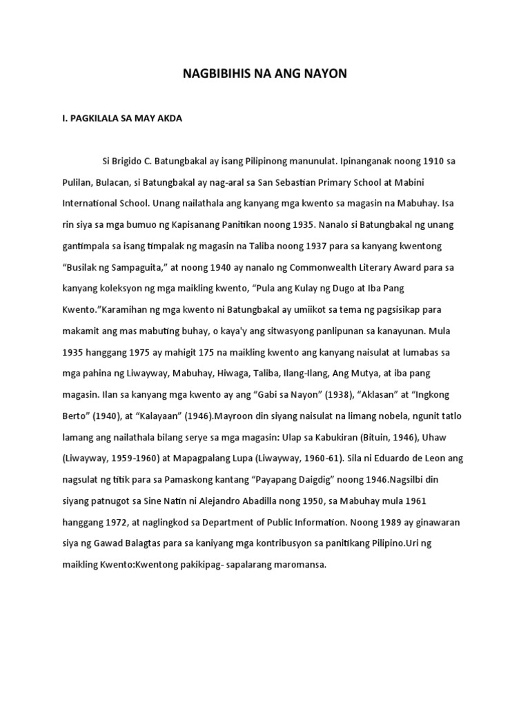 Ipinanganak noong 1910 sa Pulilan Bulacan si Batungbakal ay nag-aral sa San Sebastian Primary School at Mabini International School. Nagbibihis na ang Nayon ni. Nov 23 2011 Buod ng nagbibihis na ang nayon.