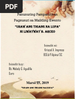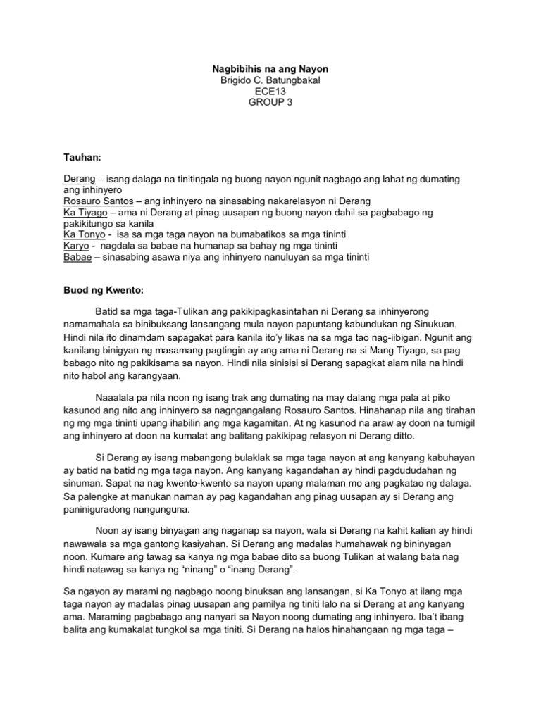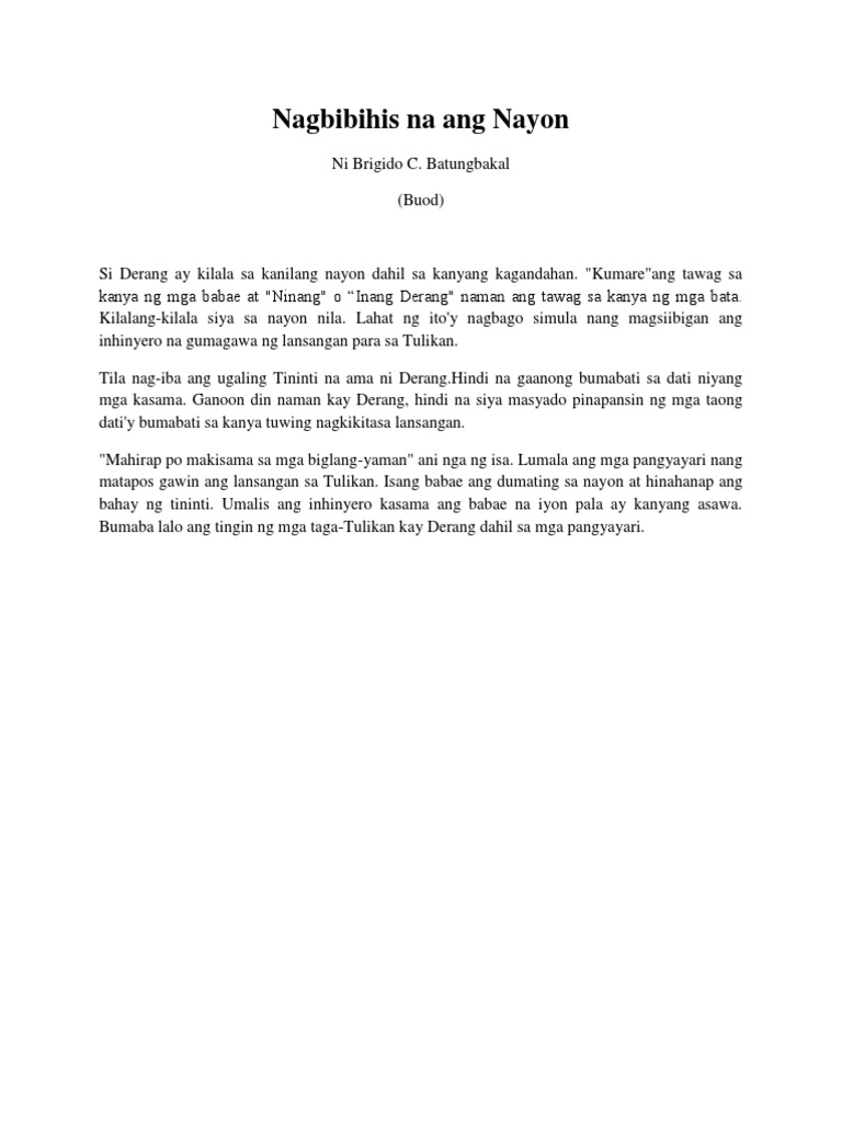 Kayo ung dahilan kung bakit nacocorupt ngaun Pilipinas. Nagbibihis na ang Nayon ni Brigido C. Batungbakal Buod Si Derang ay kilala sa kanilang nayon dahil sa kanyang kagandahan.