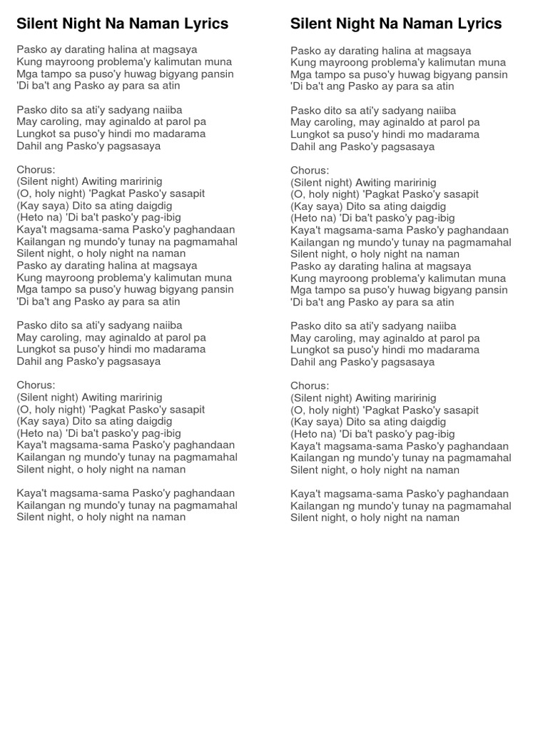 Silent Night - Americans Sing Tagalog Bisaya. Aug 02 2014 Amazing Karaoke Collection at. We tried to make lyrics as correct as possible however if you have any corrections for Silent Night Na Naman lyrics please feel free to submit them to us.